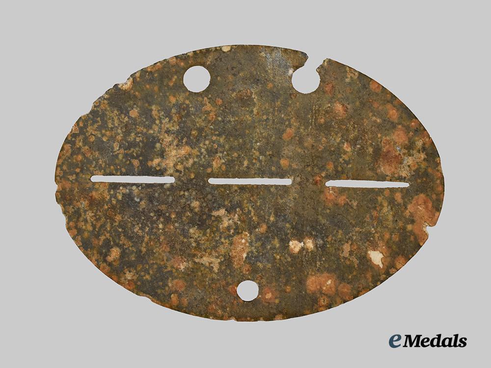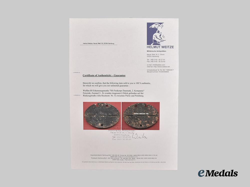 (Waffen-SS Erkennungsmarke Freikorps „Danmark“). Constructed of feinzink, the obverse bearing a double-stamped inscription of “SS-FREIKORPS DANMARK / 2. KP.”, indicating a soldier who served with 2. Kompanie, Freikorps Danmark (Free Corps Denmark) for the period of 1941-1943, perforated with three eyelets for the accommodation of a drawstring, measuring 70 mm (w) x 50 mm (h), demonstrating oxidation and chipping consistent with age and field war, a rare and desirable identification disc issued to a Danish Waffen-SS volunteer, in fair condition and accompanied by a certificate of authenticity issued by Helmut Weitze.