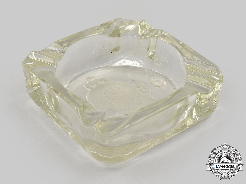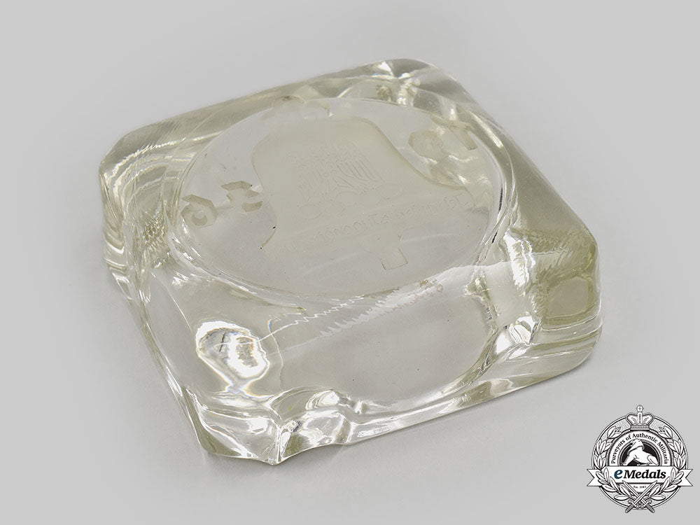 (Olympische Sommerspiele 1936 Aschenbecher). Constructed of glass, consisting of a square bowl with each corner featuring two grooves to accommodate cigarettes, the bottom featuring a detailed etched design consisting of a central bell bearing a German national eagle clutching Olympic rings, above an inscription of “ICH RUFE DIE JUGEND DER WELT” (“I CALL THE YOUTH OF THE WORLD”), flanked by a date of “1936”, otherwise unmarked, measuring 115 mm (w) x 115 mm (l) x 42 mm (h), with minor scratching evident, a unique commemorative piece in extremely fine condition.