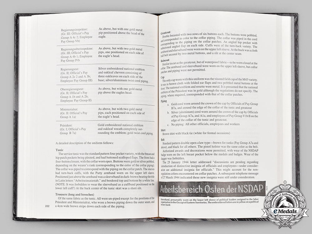 (Lehrbuch). An extremely well-preserved copy of “In the Service of the Reich: Diplomatic & Government Officials/German Red Cross” by John R. Angolia, constructed of a card stock binding with 368 paginated interior pages, featuring detailed information on the uniforms, insignia, and accessories of the Third Reich’s civil service, diplomatic corps, occupied territory administration, and German Red Cross (DRK), supplemented by an array of colour and black-and-white images and illustrations, published in 1995 by R. James Bender Publishing, San Jose, California, measuring 160 mm (w) x 235 mm (h), in extremely fine condition.