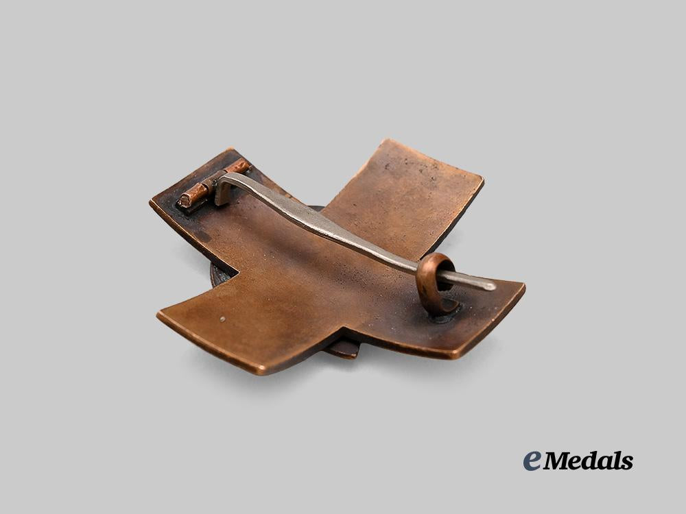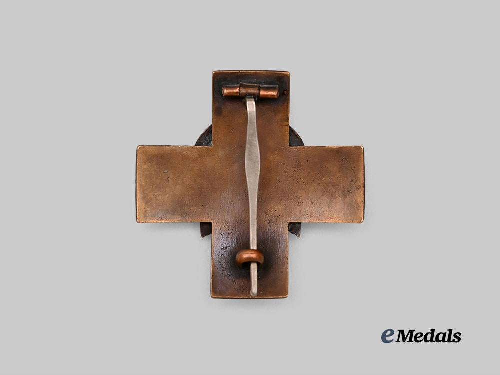 (Ehrenzeichen für deutsche Volkspflege II. Klasse). Instituted 1 May 1939. (1939-1944 issue). Constructed of gilded bronze with multi-coloured enamels, the obverse consisting of a vaulted Geneva Cross with white enameled arms, overlaid by a German national eagle executed in black enamels with gilt feathering and highlights, the reverse with a barrel hinge and banjo-style pinback meeting a rounded catch, unmarked, measuring 51.66 mm (w) x 51.66 mm (h), weighing 29.0 grams, demonstrating near-total loss of gilt throughout the base metal, as well as some flecking and surface scratching to the enamels, in very fine condition.