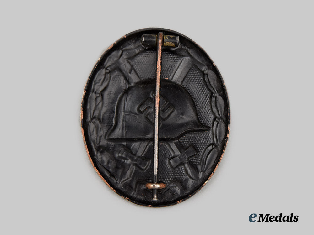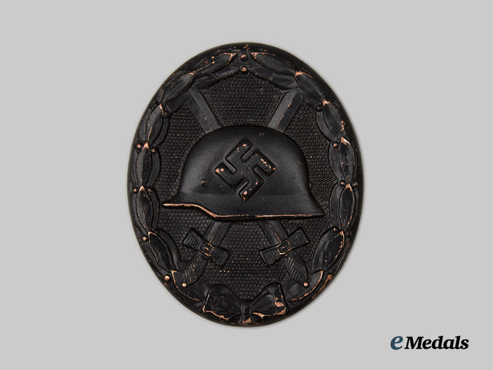 3. A Black Grade Wound Badge. (Verwundetenabzeichen in Schwarz) Instituted on March 3rd 1918. Constructed of blackened bronze, the obverse consisting of an oval laurel leaf wreath, joined together at the bottom by ribbon, with a central raised Stahlhelm overlaid by a mobile swastika, on top of crossed swords on a pebbled field, the reverse with a sheet metal hinge, round wire catch, and vertical pinback, unmarked, measuring 37.0 mm (w) x 44.5 mm (l), weighing 10.38 grams, with the majority of its black finish intact but revealing some of the bronze underneath, in near very fine condition.