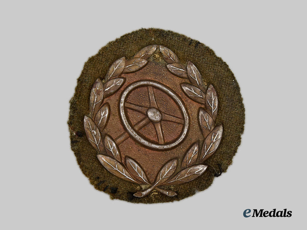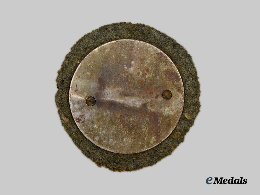 3. A Driver Proficiency Badge in Bronze. (Kraftfahrbewährungsabzeichen in Bronze). Instituted October 23rd 1942. (1942-1945 issue), constructed of bronze magnetic metal, the obverse consisting of a laurel wreath consisting of two laurel branches tied together at the base containing a depicting of a steering wheel, with a field gray wool core and a metal backer, measuring 51 mm in diameter, with all of its finish lost through age and wear, in near very fine condition.