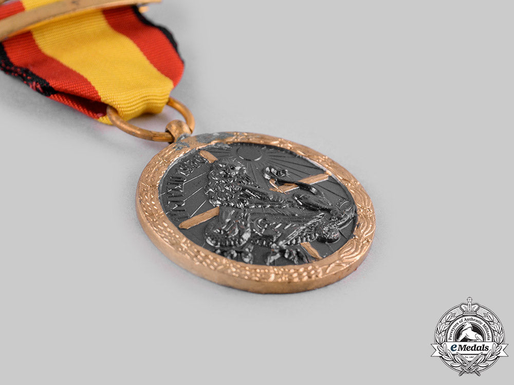 (Medaillen). A lot of three medals, including a Spanish Medal for the Campaign of 1936-1939, a rounded medal constructed of bronze, obverse applique in bronze patination exhibiting a fierce lion defeating a fall dragon with an underneath four central gilt swords, beneath of a bright sun and the date 17 JULIO 1936 (July 17, 1936), for the beginning of the Civil War, circumscribed by a gilded ornamented border, the reverse in bronze patination presenting the royal symbol of the Arrows and Yoke, a typical Spanish helm, and a period Spanish coat of arms, all of them beneath of a gilded flying eagle, surrounded by a border inscribed ARRIBA ESPAÑA GEss M FANG UNA GRANDE LIBRE IMPERIAL M. ESP. GLR, measuring 36.40 mm in diameter, light contact, on original Front Service ribbon with a traditional Spanish-style horizontal hanger with pinback, very fine.