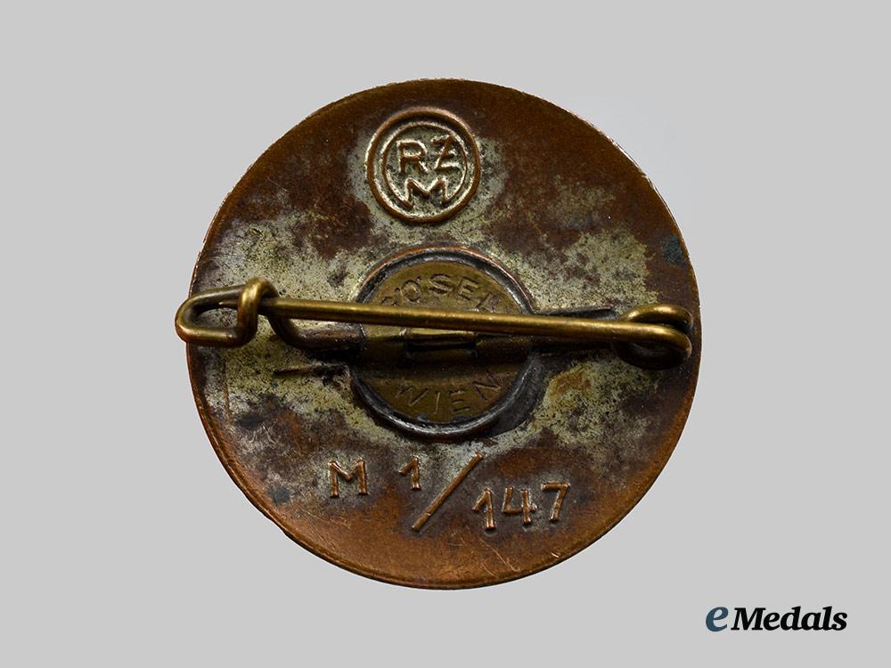 2. A NSDAP Party Badge (NSDAP Mitgliedsabzeichen). Constructed of silvered bronze with multi-coloured enamels, horizontal pinback, marked “RZM M1/147” for manufacture by Eduard Gösel, Wien”, also partially marked as such on the pinback retainer plate, measuring 23.0 mm in diameter.