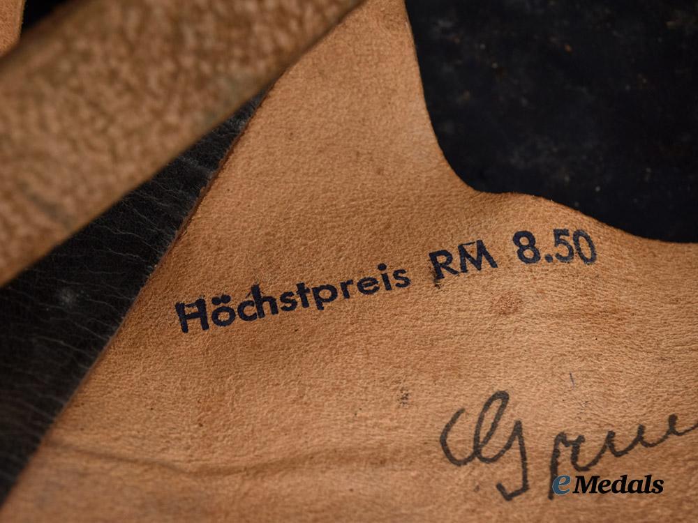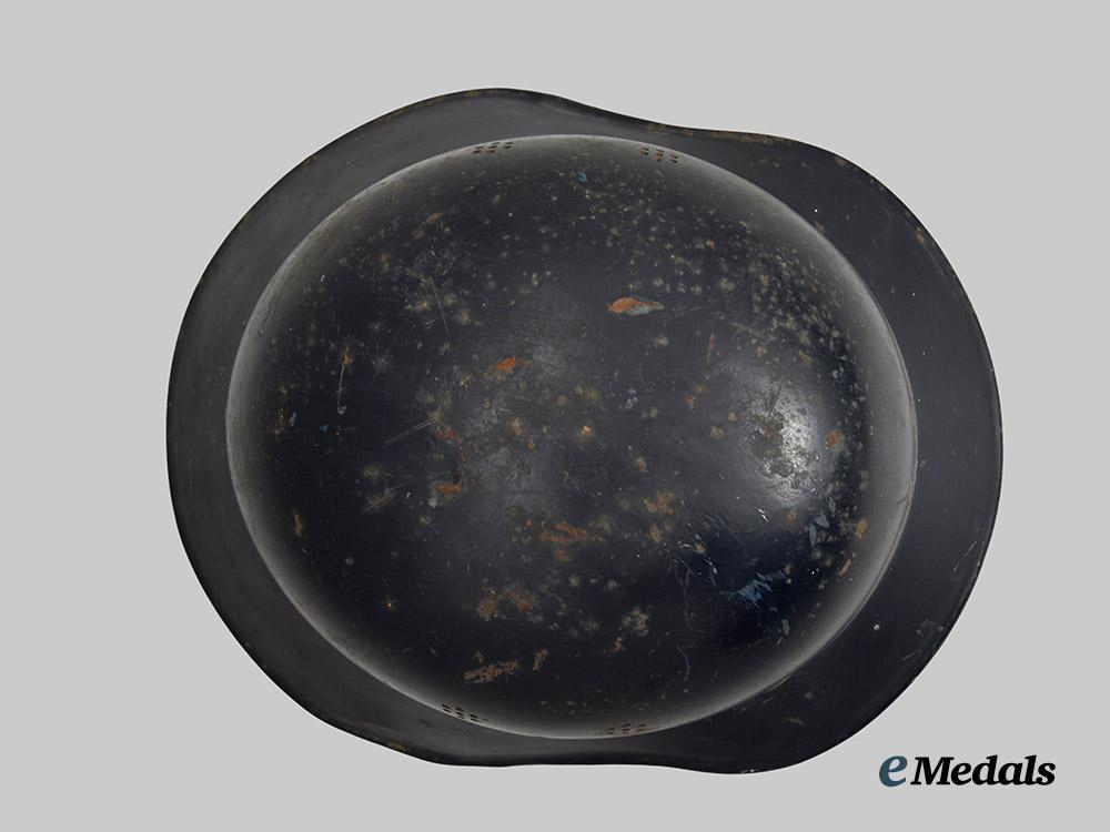 (Luftschutz Stahlhelm). A well-preserved Luftschutz Stahlhelm (steel helmet), constructed of a single sheet of magnetic molybdenum steel which retains the vast majority of its original dark slate-grey paint. Four rivets are distributed around the outer circumference for the accommodation of the interior fixtures, while the crown is flanked on each side by dual sets of ventilation holes consisting of seven eyelets each. The peak retains a mostly-intact Luftschutz decal executed in silver-grey with a transparent base, measuring 120 mm (w) x 35 mm (h). The transition point of the crown and skirt features a raised “bead” fully surrounding the shell. The interior features four cork pads, fixed in place with shell rivets, in turn accommodating a light brown leather liner which culminates in eight fingers, each perforated at the top with an eyelet through which is looped the remnants of an original drawstring. A multi-piece blackened leather chinstrap emanates from the liner and adjusts with a functional magnetic metal buckle. The back of the skirt is marked with a white ink stamp indicating that the helmet was constructed in accordance with Luftschutz regulations and is a size 58. Also stamped onto the back of the skirt is a code of “RL2-39/21” indicating manufacture by F.W. Quist, Esslingen. Notably, the liner also bears a price stamp of “RM 8.50” and a handwritten owner’s surname. The helmet measures approximately 25.5 cm (w) x 30.5 cm (l) x 16.5 cm (h). Demonstrating only minor and age-appropriate fatigue to the leather elements, this helmet remains in an extremely fine condition.