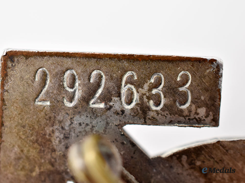 3. An HJ Proficiency Badge, Silver Grade, the obverse consisting of a Tyr rune, overlaid by a central mobile swastika, surrounded by a circular ring bearing an inscription of “FÜR LEISTUNGEN IN DER H.J.” (“FOR MERIT IN THE H.J.”), the reverse with a vertical pinback, stamped with an issue number of “292633” and marked with a Reichszeugmeisterei (RZM) logo and maker code “M1/35” for Moeller & Schröder, Offenbach, measuring 30.93 mm (w) x 51.86 mm (h).