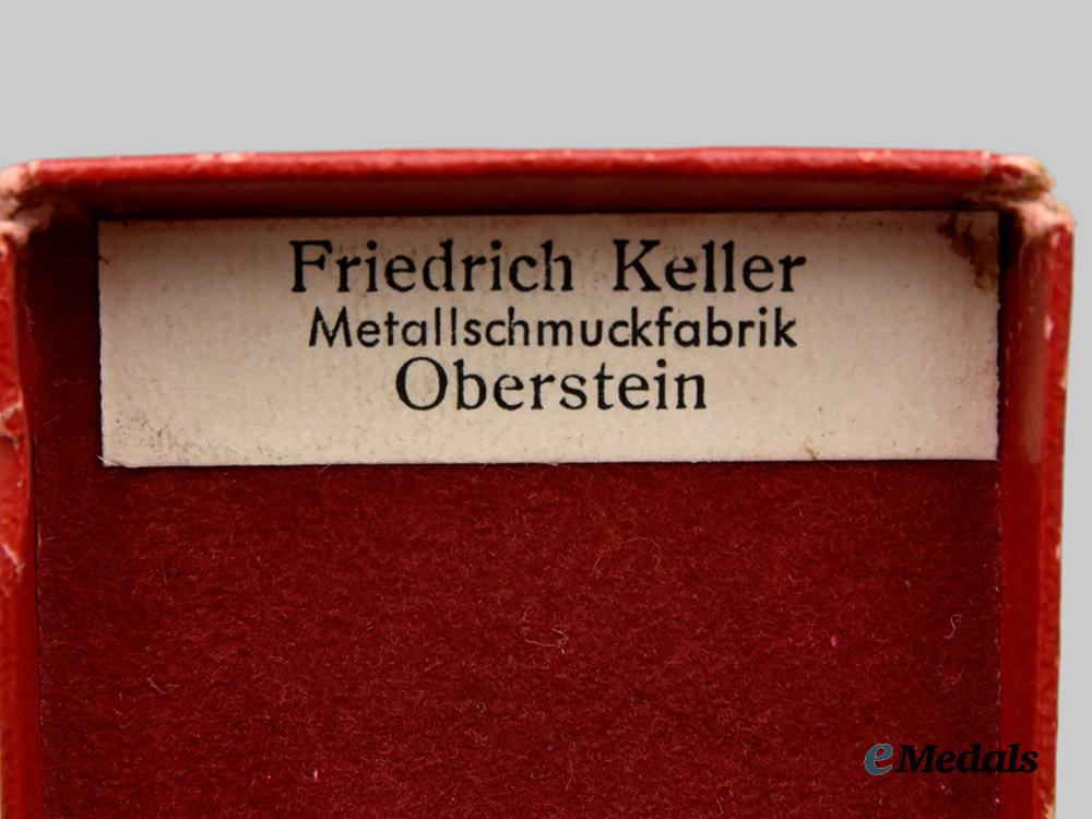 2. A Civil Service 25-Year Faithful Service Award, constructed of silvered bronze with enamels, on loop for suspension from its period original ribbon with horizontal pinback, consisting of a Cross Pattée with pebbled arms joined through the quadrants by a circular oak leaf wreath, the obverse bearing a central black enameled swastika, the reverse bearing a central raised inscription of “FÜR TREUE DIENSTE” (“FOR FAITHFUL SERVICE”), unmarked, measuring 41.35 mm (w) x 46.06 mm (h), weighing 21.3 grams (inclusive of ribbon), accompanied by its original presentation case, of two-piece card stock construction, the exterior with a faux red leather liner, the lid bearing a silvered number “25” situated within a cogwheel, the interior lined throughout both the lid and medal bed with red felt, the former retaining a maker’s label reading “FRIEDRICH KELLER, METALLSCHMUCKFABRIK, OBERSTEIN”, measuring 45 mm (w) x 100 mm (l) x 15 mm (h), demonstrating minor loss of finish and material fatigue to the award and case, respectively, in near extremely fine condition.