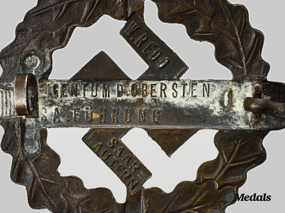 1. A Sturmabteilung (SA) Sports Badge, Bronze Grade, constructed of of bronzed magnetic metal, the obverse consisting of a circular oak leaf wreath, surrounding a mobile swastika set over a hollow void and overlaid by a a sword, the reverse with an integral hinge and vertical pinback meeting a flat wire catch, maker marked “W. REDO, SAARLAUTERN”, measuring 46.80 mm (w) x 58.98 mm (h), weighing 16.7 grams, demonstrating some tarnishing and loss of finish, in very fine condition.