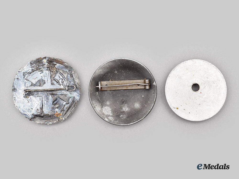 1. A Reich Labour Service of Female Youth (RADwJ) rank badge, constructed of silvered zink, horizontal pinback, marked with a Reichsleitung des Reichsarbeitsdiensts (RLAD) logo and an unidentified maker’s mark, measuring 45 mm in diameter, demonstrating loss of finish and minor oxidation, in very fine condition.