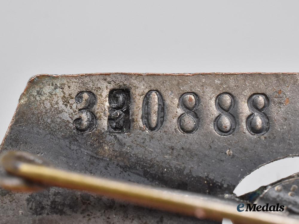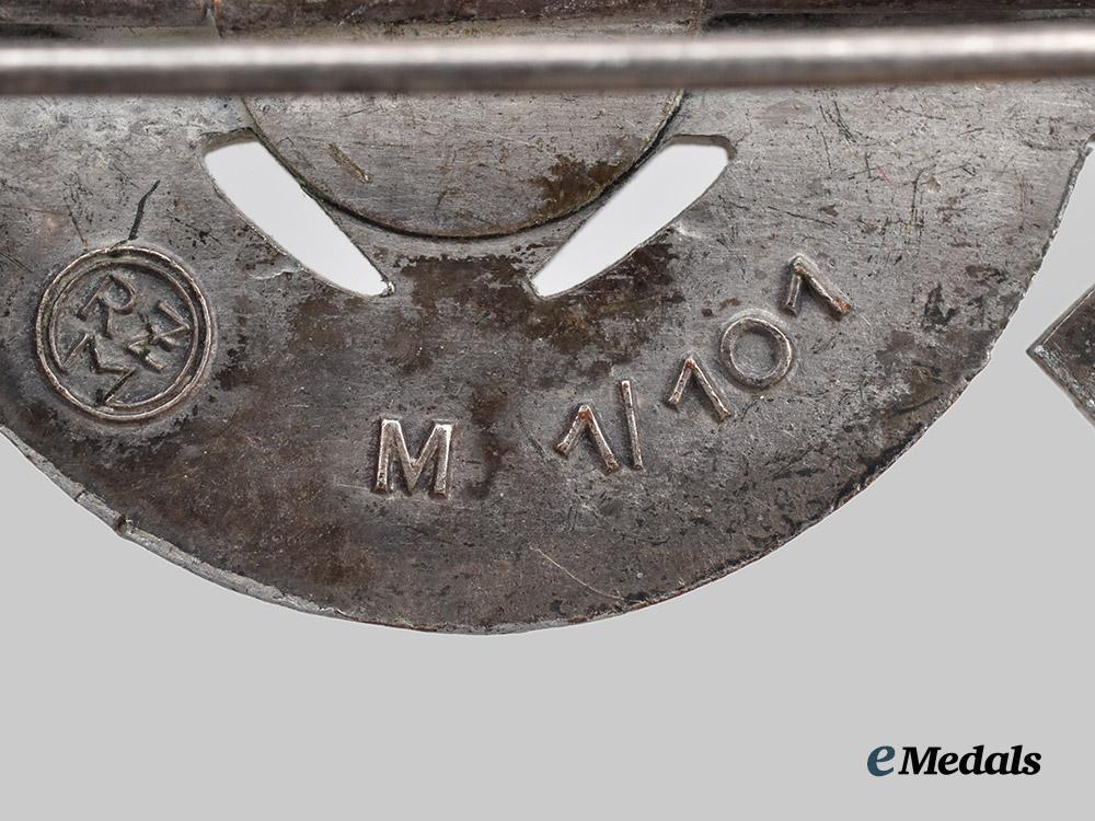 1 A Deutsches Jungvolk (DJ) Proficiency Badge, Silver Grade, constructed of a silvered copper alloy, the obverse consisting of a Sig rune, overlaid by a central mobile swastika, situated within a circular ring bearing a raised inscription of “FÜR LEISTUNGEN IM D.J.” (“FOR MERIT IN THE D.J.”), the reverse with a vertical pinback, stamped with an issue number of “330888”, marked with a Reichszeugmeisterei (RZM) logo and maker code “M1/63” for Steinhauer & Lück, Lüdenscheid, measuring 30 mm (w) x 45 mm (h), demonstrating moderate loss of silver finish throughout, in very fine condition.