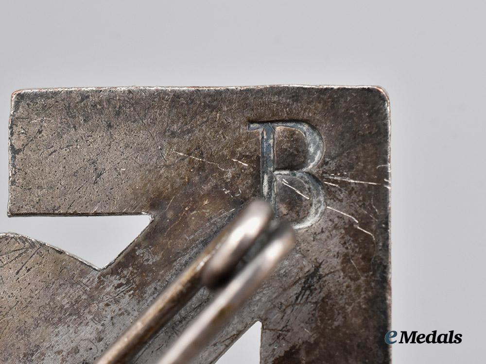 2. An HJ Proficiency Badge, Silver Grade, constructed of a silvered copper alloy, the obverse consisting of a Tyr rune, overlaid by a central mobile swastika, situated within a circular ring bearing a raised inscription of “FÜR LEISTUNGEN IN DER H.J.” (“FOR MERIT IN THE H.J.”), the reverse with a vertical pinback, stamped with a letter “B” indicating second issue, marked with an RZM logo and maker code “M1/101” for Gustav Brehmer, Markneukirchen, measuring 30 mm (w) x 52 mn *h), demonstrating minor loss of silver finish, in near extremely fine condition.