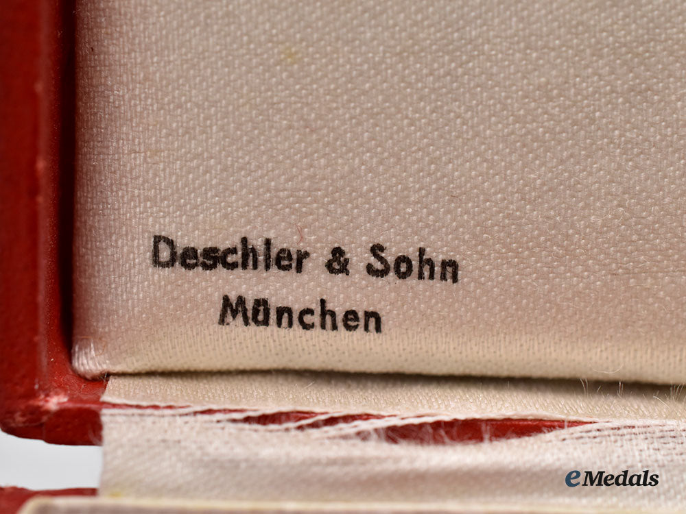 4. A presentation case for a Civil Service 40-Year Faithful Service Cross, constructed of a light wooden frame with a faux red leather exterior liner, the lid bearing a gilded and wreathed number “40”, the interior with a padded white rayon lid liner and partially-intact hinge cover, the former maker marked “DESCHLER & SOHN, MÜNCHEN”, with a slotted maroon velvet medal bed, closing with a functional metal spring catch with exterior stud release, measuring 48 mm (w) x 100 mm (l) x 20 mm (h), in near extremely fine condition.