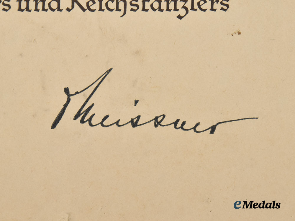 1. An award document for a Sudetenland Medal, constructed of off-white paper stock with black ink, named to “POSTSEKRETÄR FRIEDRICH HANEWACKER” of Meißen, issued in BErlin on 6 February 1940, certified by the facsimile signature of Otto Meissner, measuring 21 cm (w) x 29.5 cm (h), demonstrating moderate discolouration throughout, in very fine condition.