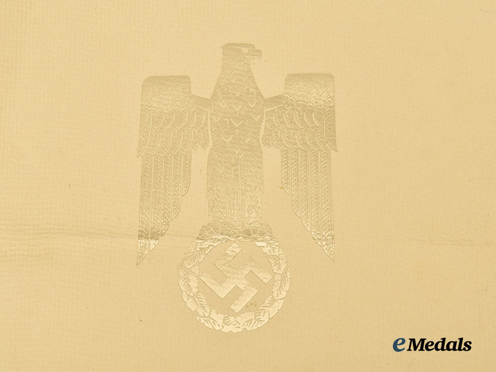 6. An award folio, constructed of off-white card stock, the cover bearing a gilt NSDAP-style German national eagle clutching a wreathed mobile swastika, unmarked, measuring 25.5 cm (w) x 36.5 cm (h), demonstrating moderate material fatigue throughout, in very fine condition.