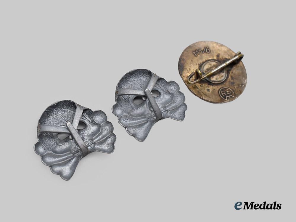 2. A matching set of Heer Panzer collar tab cyphers, each constructed of silvered zink, the obverse of each consisting of a jawless Danziger-style Totenkopf, the edges retaining all three attachment prongs, both unmarked and measuring 25 mm (w) x 25 mm (h), demonstrating total loss of silver finish throughout, in very fine condition.