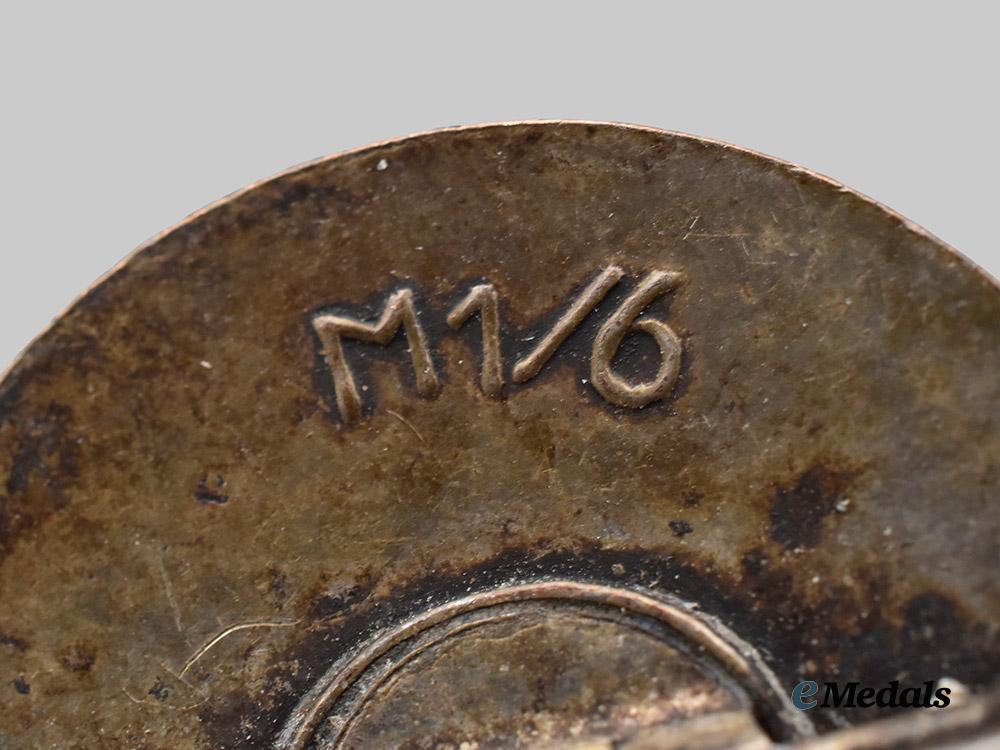 1. An NSDAP membership badge, constructed of silvered bronze with multi-coloured enamels, horizontal pinback, the reverse marked with a Reichszeugmeisterei (RZM) logo and maker code “M1/6” for Karl Hensler, Pforzheim, demonstrating some flecking and loss of finish to the enamels and base metal, in near extremely fine condition.