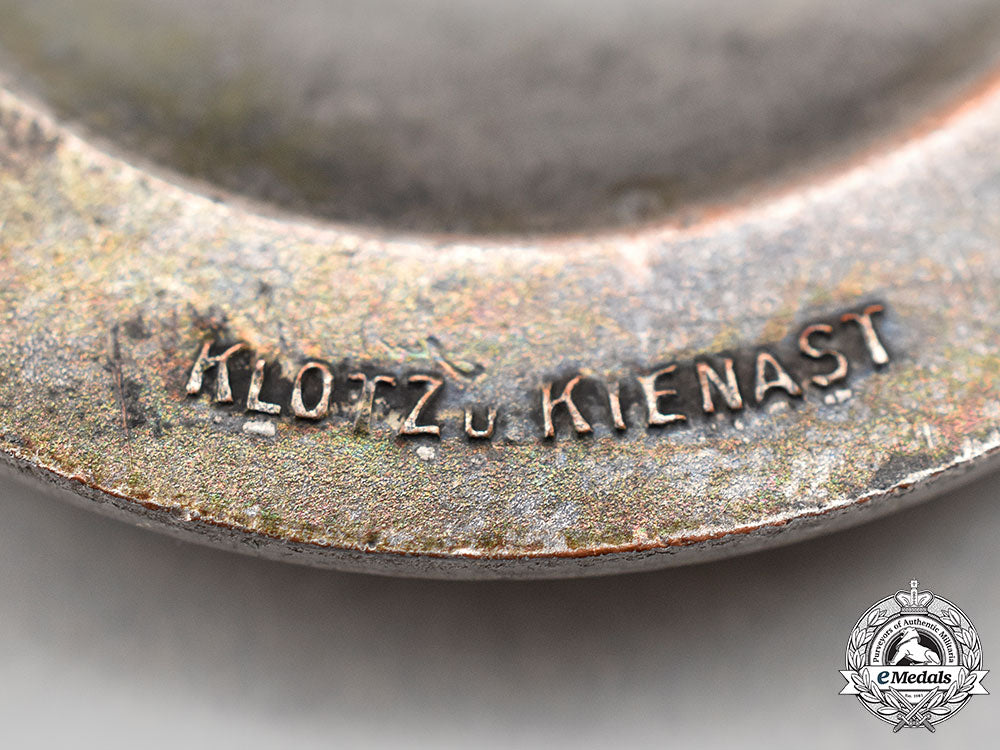 2. A 1936 Leipzig German Lawyers Day commemorative badge, constructed of silvered bronze, horizontal pinback, the reverse maker marked “KLOTZ U. KIENAST” for the Munich-based firm, measuring 35 mm in diameter, with minor loss of finish evident, in near extremely fine condition.