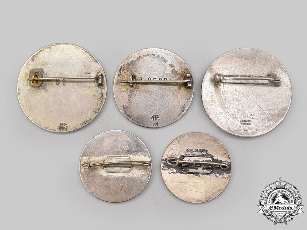 (Nationalsozialistisches Volkswolfahrt Abzeichen). A mixed lot of five Nationalsozialistische Volkswohlfahrt (National Socialist People’s Welfare/NSV) badges, including: