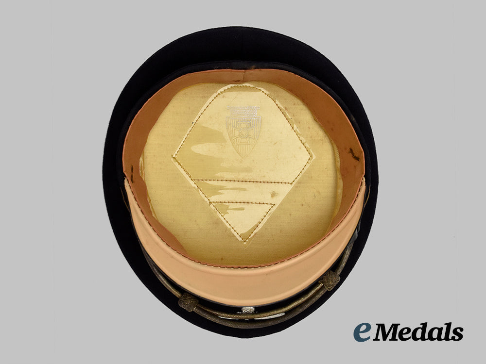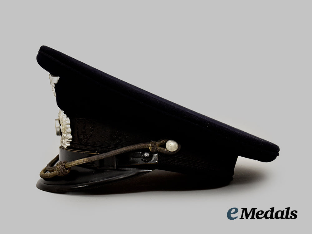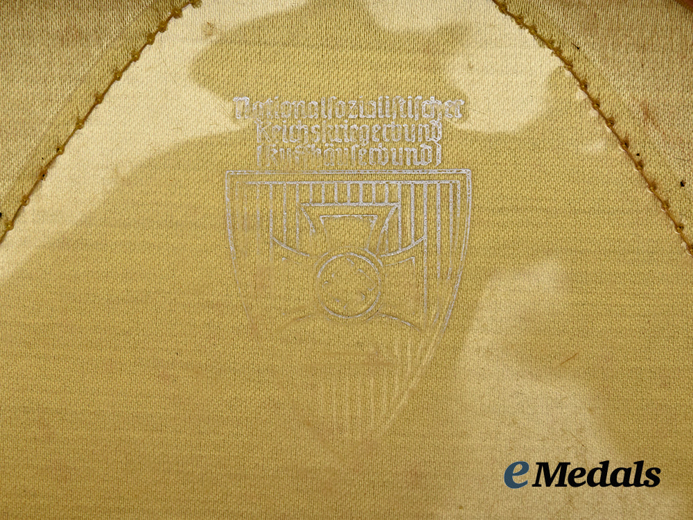 (NS-Reichskriegerbund Kyffhäuser Schirmmütze). An unusual NS-Reichskriegerbund (National Socialist Reich Warriors League/NSRKB) visor cap, constructed of dark navy blue wool. It features reinforced side walls fully lined on the exterior with a black rayon cap band which features alternating Kyffhäuserbund insignia and mobile swastikas. The crown is trimmed with a band of identical dark navy blue wool piping. Pinned onto the peak is an aluminum insignia consisting of an NSRKB-style German national eagle clutching a wreathed mobile swastika, measuring 65 mm (w) x 25 mm (h). Pinned onto the centre of the cap band directly below the eagle is an additional insignia, consisting of an aluminum oak leaf wreath surrounding a tri-colour cockade with a red wool centrepiece, measuring 65 mm (w) x 45 mm (h) overall. The cap band is flanked by blackened magnetic metal domed rivets which secures in place a black leatherette chinstrap, which is itself adjusted with two functional magnetic metal buckles. Notably, two additional silvered and pebbled magnetic metal buttons have been added to the cap just above the blackened rivets, accommodating a silver aluminum wire chinstrap which is adjusted with dual sliding knots (possibly indicating a Leader upgrade). A protruding black vulcanfibre visor completes the exterior features. The interior is fully encompassed by a beige rayon liner, while the crown retains an intact transparent plastic moisture guard inset with a hollow channel for the insertion of a nametag, and which bears an intact NSRKB insignia. The side walls are surrounded by an intact brown leather sweatband. The cap measures approximately 24 cm (w) x 27 cm (l) x 14.5 cm (h). Minor material fatigue consistent with age and wear is evident, while the buttons accommodating the wire chinstrap have pierced the sweatband. A superb example in near extremely fine condition.