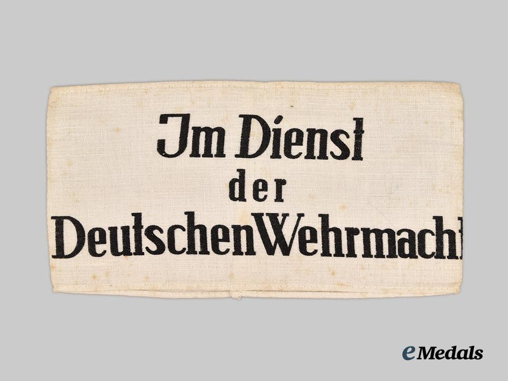 1. A State Service armband, constructed of yellow cotton, the exterior bearing a machine-embroidered black government-style German national eagle clutching a wreathed mobile swastika, unmarked, measuring 18 cm (w) x 10.5 cm (h) when folded on a flat surface, in extremely fine condition.