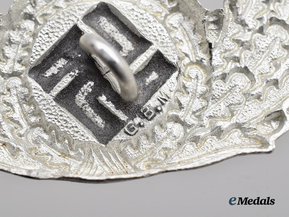 2. A Police ammunition cartouche badge, constructed of aluminum, the obverse consisting of a semi-circular oak leaf wreath, overlaid by a German national eagle clutching a wreathed mobile swastika, the reverse retaining all three lugs, maker marked “G.B.M.” likely indicating manufacture by Gustav Brehmer, Markneukirchen, measuring 100 mm (w) x 55 mm (h), in near mint condition.