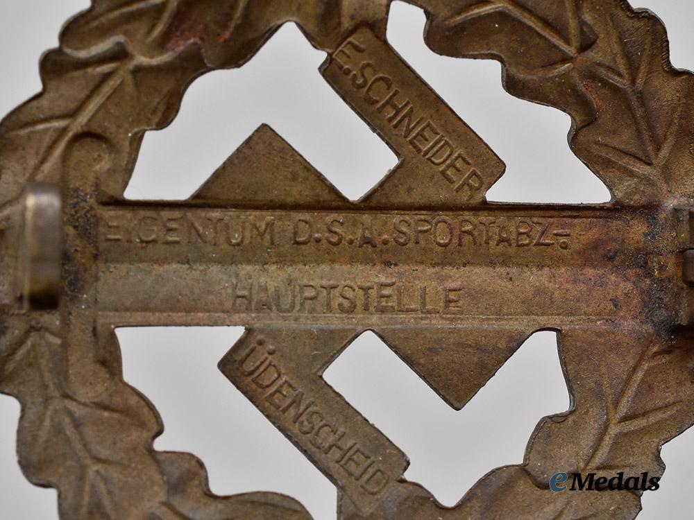 1. A Sturmabteilung (SA) Sports Badge, Bronze Grade, constructed of bronzed magnetic metal, the obverse consisting of a circular oak leaf wreath, surrounding a central mobile swastika overlaid by a sword, the reverse with a barrel hinge and vertical pinback meeting a flat wire catch, maker marked “E. SCHNEIDER, LÜDENSCHEID”, measuring 45.27 mm (w) x 57.77 mm (h), weighing 17.4 grams, a Type II badge in near extremely fine condition.
