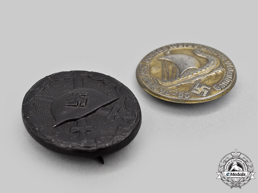 1. A Black Grade Wound Badge, constructed of blackened magnetic metal, the obverse consisting of an oval laurel leaf wreath, joined together at the bottom by ribbon, around a central raised Stahlhelm overlaid by a mobile swastika, on top of crossed swords on a pebbled field, maker marked with LDO code “L/56” for Funcke and Brüninghaus, Lüdenscheid, measuring 37.41 mm (w) x 45.07 mm (h), weighing 13.0 grams, in extremely fine condition.