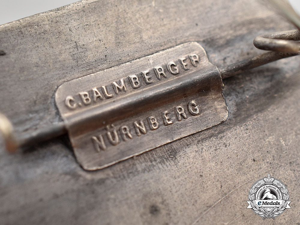 2. A 1938 Munich Economic Policy Commission seminar participant’s badge, constructed of silvered bronze, horizontal pinback, the reverse maker marked “C. BALMBERGER, NÜRNBERG”, measuring 35 mm (w) x 45 mm (h), in extremely fine condition.