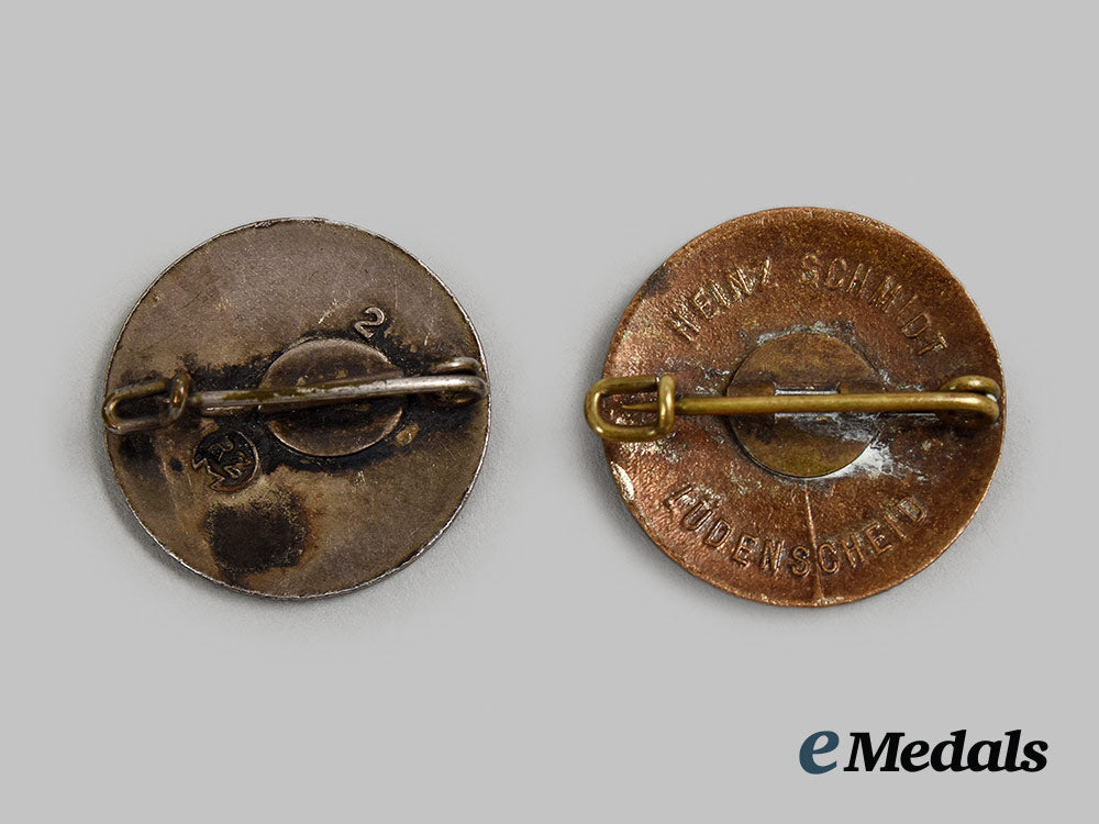 2. A Mercedes-Benz employee badge, constructed of silvered bronze with enamels, horizontal pinback, the reverse maker marked “HEINZ SCHMIDT, LÜDENSCHEID”, measuring 20 mm in diameter, demonstrating some flecking and surface scratching to the enamels, in very fine condition.