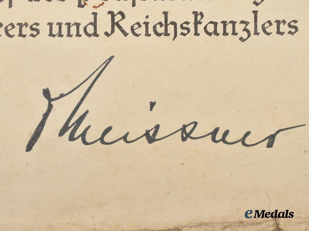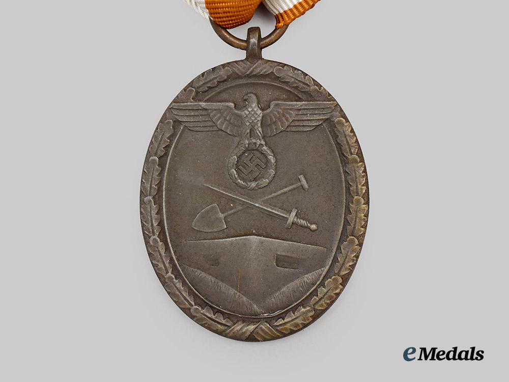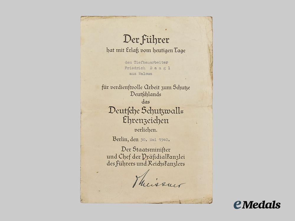 2. A West Wall Medal, constructed of bronzed zink, on loop for suspension from its period original ribbon, consisting of a double-sided oval oak leaf wreath, joined together at the top and bottom by ribbon, the obverse bearing a raised pillbox topped by a crossed sword and shovel and a German national eagle clutching a wreathed mobile swastika, the reverse bearing a raised inscription of “FÜR ARBEIT ZUM SCHUTZE DEUTSCHLANDS” (“FOR WORK IN THE PROTECTION OF GERMANY”), unmarked, measuring 33.34 mm (w) x 45.52 mm (h), weighing 13.6 grams, accompanied by its original package of issue, constructed of beige paper stock, the exterior bearing a maker’s mark of “CARL POELLATH, SCHROBENHAUSEN”, measuring 60 mm (w) x 105 mm (h), demonstrating near-total loss of bronze finish to the base metal of the award, in very fine condition; also accompanied by its award document, named to Tiefbauarbeiter (Civil Engineer Worker) “FRIEDRICH DANGLE”, a resident of Walsum, dated 30 May 1940 and certified by the facsimile signature of Otto Meissner, measuring 15 cm (w) x 21 cm (h), demonstrating some material fatigue, in better than very fine condition.