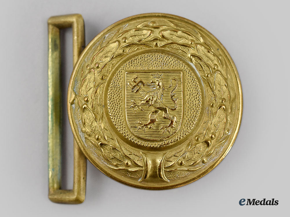 2. A belt buckle, constructed of gilded brass, the obverse consisting of a circular oak leaf wreath surrounding a Thuringian coat of arms, the reverse with a clip and swivel buckle, unmarked, measuring 50 mm in diameter, with minor verdigris visible, in near extremely fine condition.