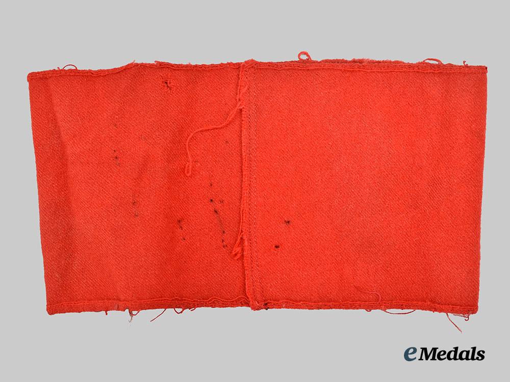 1. An NSDAP member’s armband, constructed of red wool, the exterior overlaid by a white wool disc bearing a multi-piece black mobile swastika, measuring 20.5 cm (w) x 10.5 cm (h) when folded on a flat surface, demonstrating moderate material fatigue and soiling, an unusual example in very fine condition.