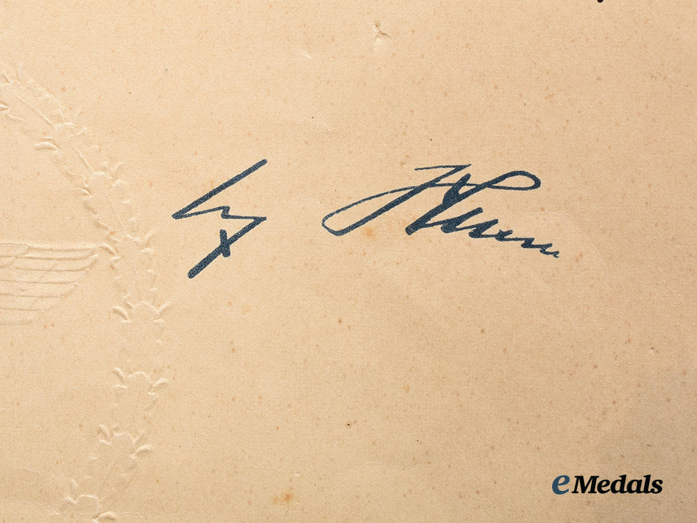 Accompanied by its original award document, constructed of off-white paper with multi-coloured ink, named to “HERRN. ANDRÉ P. CHEVALLIER”, issued in Berlin on 30 January 1937 and certified by a facsimile signature of AH, measuring 20 cm (w) x 28 cm (h), with some discolouration and a small tear visible to the upper right corner, in near extremely fine condition.