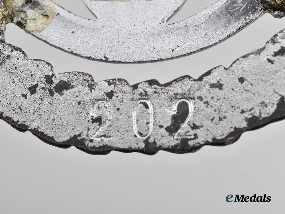 (Standschützenverband Tirol-Vorarlberg Meisterschützenabzeichen mit Inschrift 6 Jahre Gaumeisterschütze). Constructed of silvered and gilded zink with multi-coloured enamels, the obverse consisting of a circular oak leaf wreath, surrounding a central red enameled Tyrol-style German national eagle clutching a bullseye target defaced by a swastika, in turn situated above a banner bearing an inscription of “6. JAHRE GAUMEISTERSCHÜTZE” (“6 YEAR GAU CHAMPION SHOOTER”), the reverse with a clip hinge and horizontal pinback meeting a locking catch, stamped with an issue number of “202”, otherwise unmarked, measuring 64 mm in diameter, period repairs are visible to the eagle’s enamel, while the eagle itself has been re-applied to the badge with glue (with the lower half once again detached), in addition to some loss of finish to the wreath, a repaired example in very fine condition.