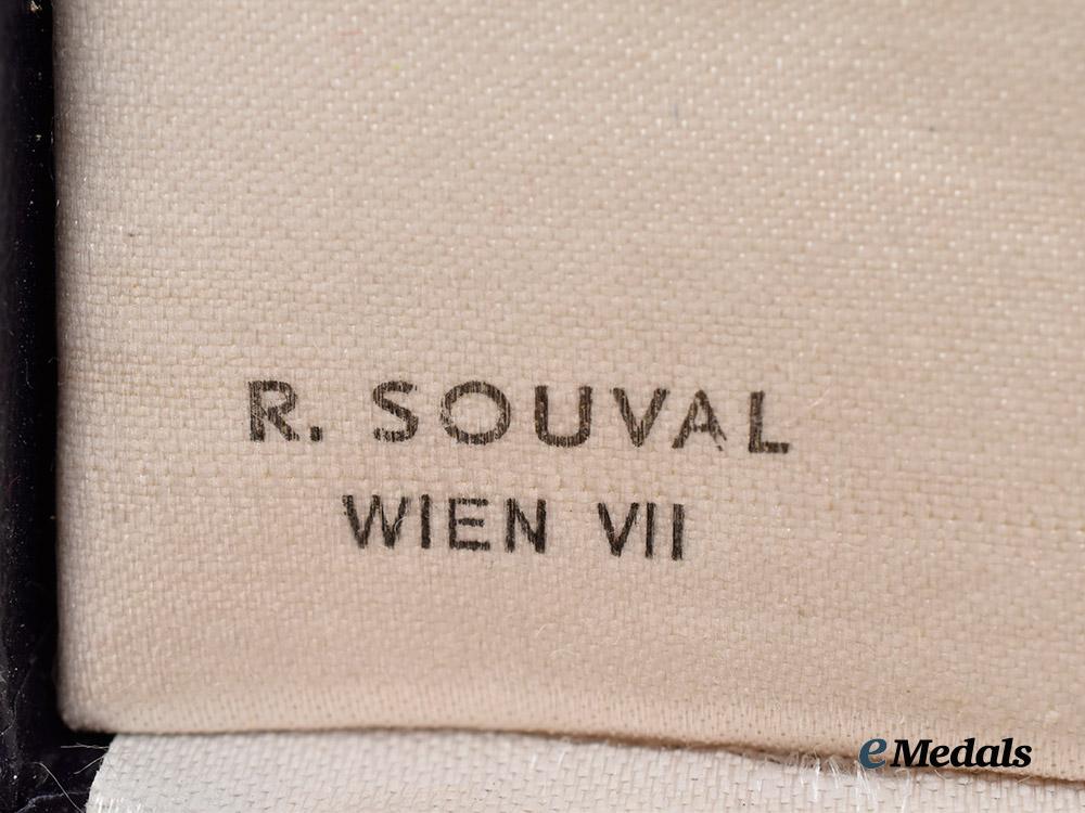 (Ehrenkreuz der Deutschen Mutter in Silber mit Miniatur und Etui). Constructed of silvered bronze with multi-coloured enamels, on loop for suspension from its period original ribbon, consisting of a Latin Cross with its arms joined through the quadrants by stylized rays, the obverse with blue and white enameled arms, bearing a central white enameled disc overlaid by a black swastika, circumscribed by an inscription of “DER DEUTSCHEN MUTTER” (“TO THE GERMAN MOTHER”), the reverse bearing an etched institution date of “16. DEZEMBER 1938” and a signature of the Führer, unmarked, measuring 36 mm (w) x 46 mm (h), accompanied by a matching miniature, of identical construction and composition, on loop for suspension from its period original bow tie-style ribbon with horizontal pinback, the reverse maker marked with LDO code “L/11” for Wilhelm Deumer, Lüdenscheid, measuring 15 mm (w) x 20 mm (h), both secreted within an original presentation case, constructed of a pressed card stock frame with a faux dark blue leather exterior liner, the lid bearing a silvered depiction of the award, the interior with a white rayon lid liner and intact hinge cover, the former marked marked “RUDOLF SOUVAL, WIEN”, with a slotted white felt medal bed, closing with a functional metal spring catch with exterior stud release, measuring 52 mm (w) x 110 mm (l) x 18 mm (h), demonstrating flecking and loss of finish to both awards, in overall better than very fine condition.