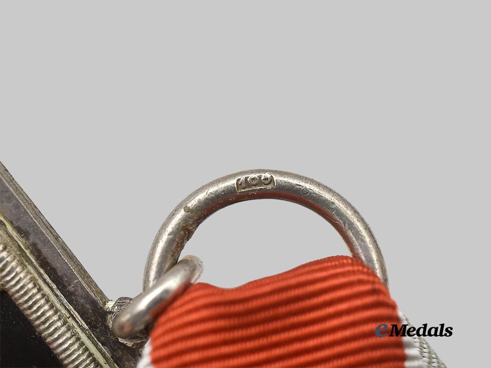 (Eisernes Kreuz 1939 II. Klasse). Reinstituted 1 September 1939. (1939-1945 issue). Constructed of iron and silver, on loop for suspension from its period original ribbon, consisting of a Cross Pattée with a blackened magnetic iron core within a ribbed silver frame, the obverse with a central mobile swastika, the six o’clock arm with a reinstitution date of “1939”, the reverse six o’clock arm with an initial institution date of “1813”, the suspension loop maker marked with Präsidialkanzlei code “100” for Wächtler & Lange, Mittweida, measuring 44.02 mm (w) x 49.80 mm (h), weighing 19.3 grams, in near extremely fine condition.