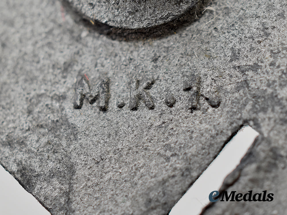 3. An Infantry Assault Badge, Silver Grade, constructed of silvered zink, the obverse consisting of an oval oak leaf wreath, joined together at the bottom by ribbon, topped by a Heer-style German national eagle clutching a mobile swastika, diagonally across the badge is a Karabiner 98k rifle with the bayonet attached and the carrying sling hanging from the rifle, the reverse with a ball hinge and vertical pinback meeting a round wire catch, maker marked with the logo of Metall und Kunststoff, Gablonz, measuring 47.66 mm (w) x 62.02 mm (h), weighing 26.6 grams, demonstrating near-total loss of silver finish, in very fine condition.