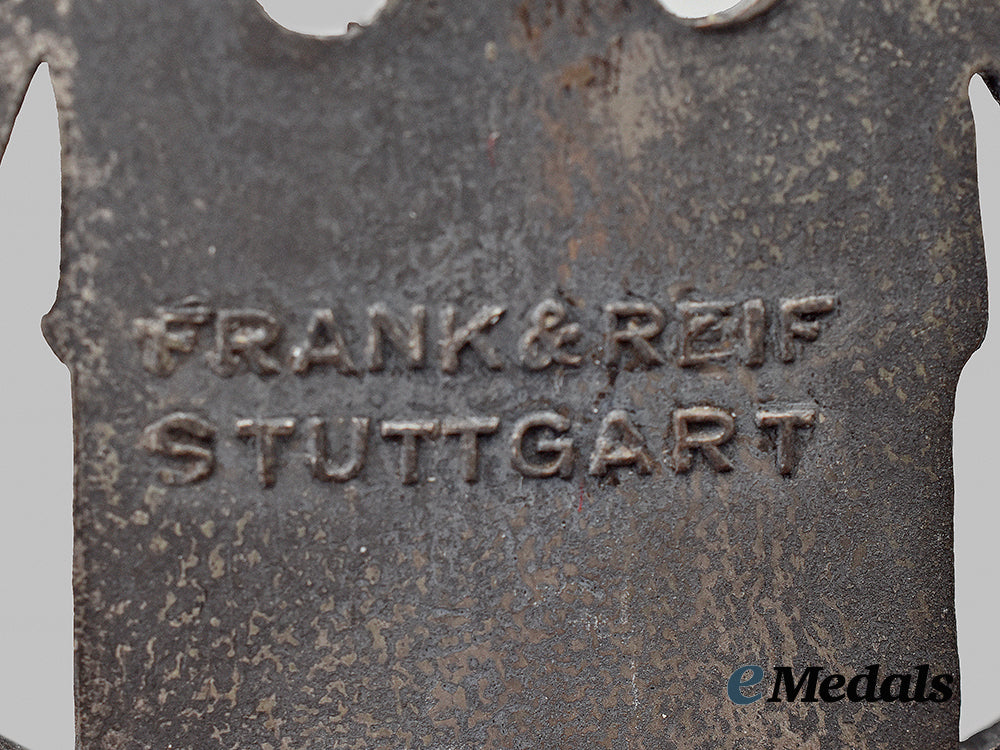 4. A General Assault Badge, constructed of silvered zink, the obverse consisting of an oval oak leaf wreath, around a central Heer-style German national eagle clutching a mobile swastika, above a crossed bayonet and stick grenade, the reverse with a crimped hinge and vertical pinback meeting a round wire catch, maker marked “FRANK & REIF, STUTTGART”, measuring 41.55 mm (w) x 52.16 mm (h), demonstrating near-total loss of silver finish, in very fine condition.