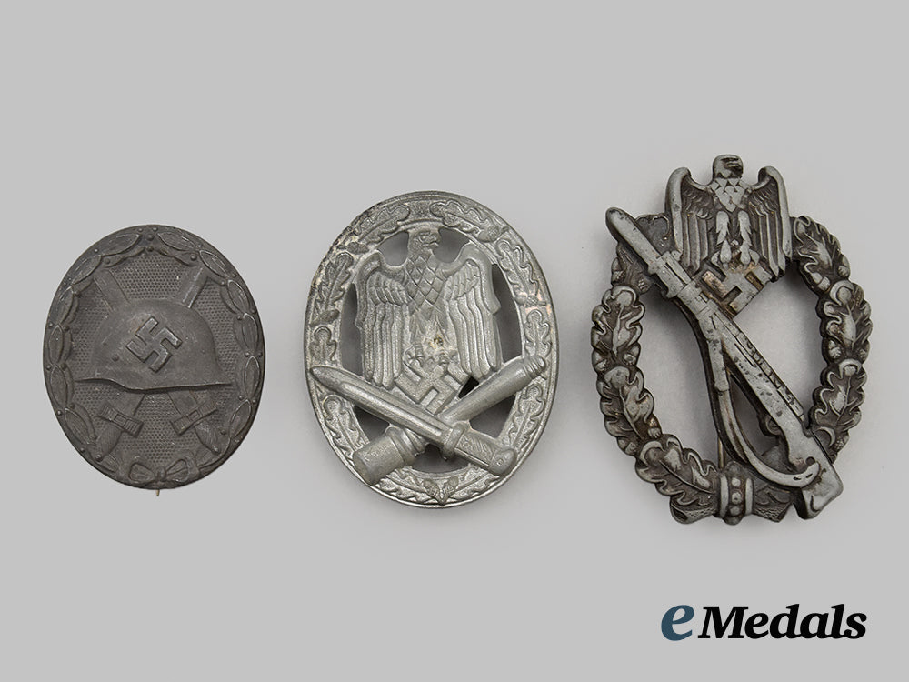 1. An Infantry Assault Badge, Silver Grade, constructed of silvered zink, the obverse consisting of an oval oak leaf wreath, joined together at the bottom by ribbon, topped by a Heer-style German national eagle clutching a mobile swastika, diagonally across the badge is a Karabiner 98k rifle with the bayonet attached and the carrying sling hanging from the rifle, the reverse with a barrel hinge and vertical pinback meeting a round wire catch, maker marked with the logo of F.W. Assmann & Söhne, Lüdenscheid, measuring 47.54 mm (w) x 61.70 mm (h), demonstrating total loss of silver finish, in fair condition.