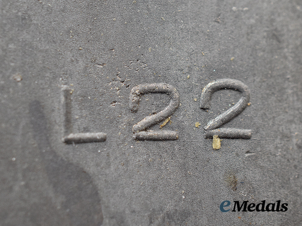 3. A Silver Grade Wound Badge, constructed of silvered zink, the obverse consisting of an oval laurel leaf wreath, joined together at the bottom by ribbon, with a central raised Stahlhelm overlaid by a mobile swastika, on top of crossed swords on a pebbled field, the reverse with a crimped hinge and vertical pinback meeting a round wire catch, maker marked with LDO code “L22” for Rudolf Souval, Vienna, measuring 36.40 mm (w) x 43.84 mm (h), weighing 17.0 grams, demonstrating near-total loss of silver finish, in very fine condition.
