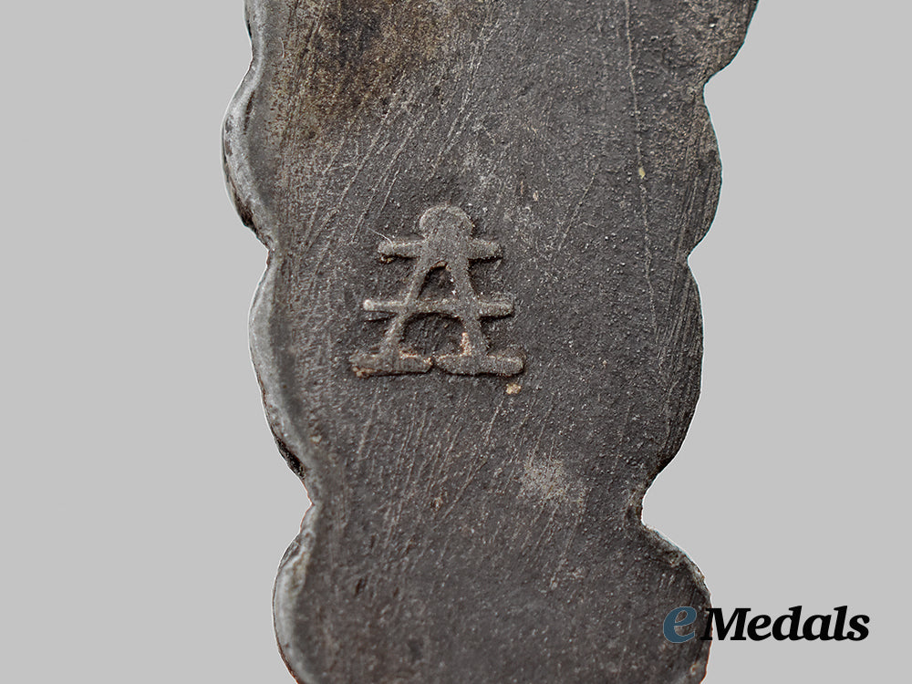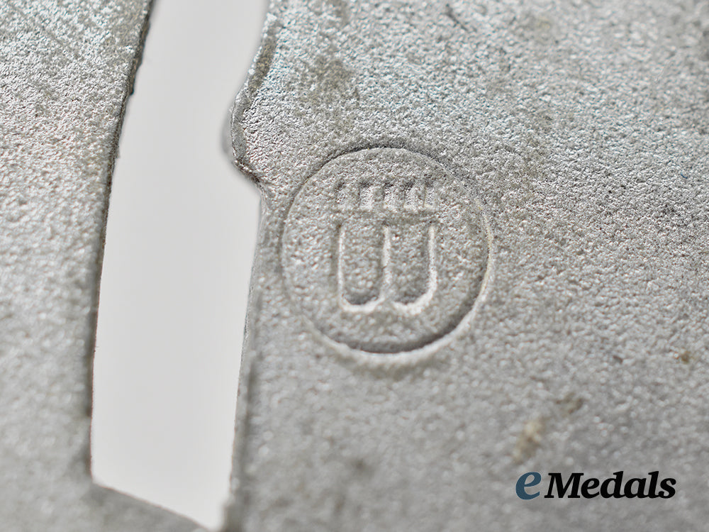 2. A General Assault Badge, constructed of silvered zink, the obverse consisting of an oval oak leaf wreath, around a central Heer-style German national eagle clutching a mobile swastika, above a crossed bayonet and stick grenade, the reverse with a crimped hinge and vertical pinback meeting a round wire catch, maker marked with the logo of E. Ferdinand Wiedmann, Frankfurt, measuring 42.39 mm (w) x 52.86 mm (h), weighing 28.6 grams, in better than very fine condition.