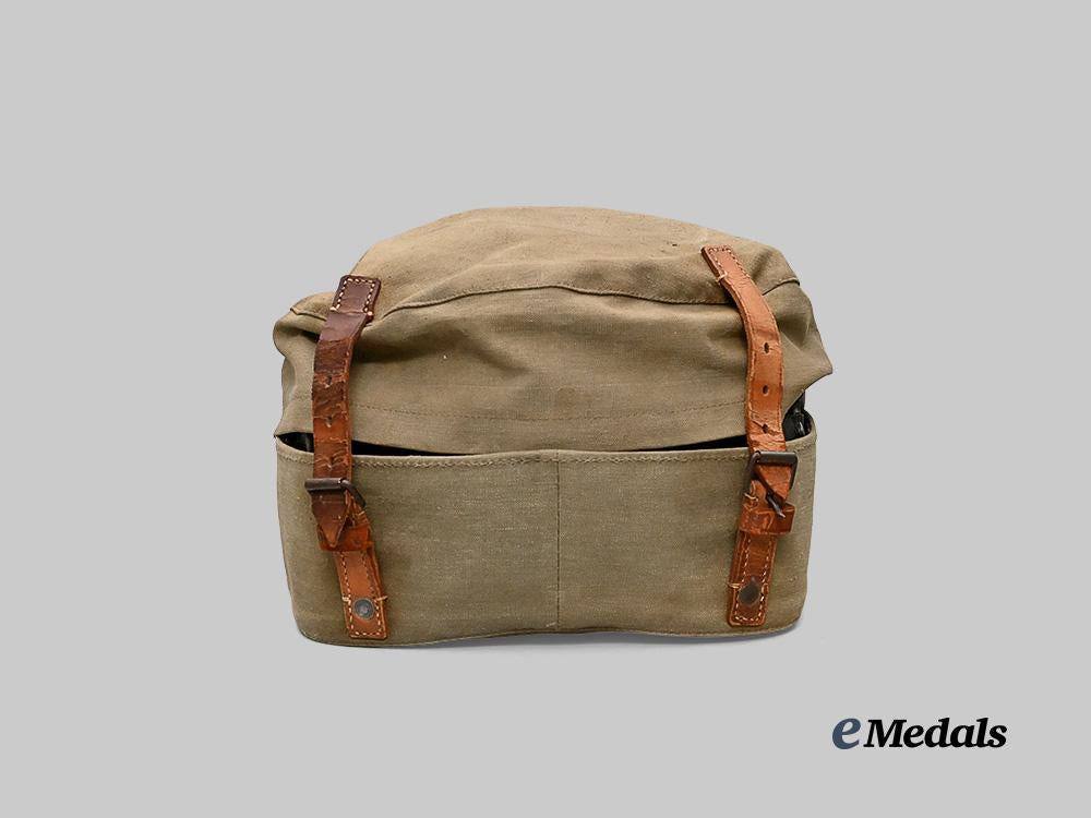 (Wehrmacht Pferdegasmaske 38). A well-preserved Model 38 horse and mule gas mask, constructed of a heavy slate-grey rubber casing, featuring frontal and lateral filters fixed in position with rubber straps securing magnetic metal loops, with the former unfastening to allow for filter replacement, with a hollow interior featuring a malleable lip to form a tight seal around the animal’s muzzle, flanked on each side by magnetic metal buckles accompanied by matching multi-piece brown leather straps to allow the mask to be firmly attached to the animal’s head, one side stamped with a Waffenamt mark and date of “40”, measuring 28 cm (w) x 23.5 cm (l) 20.5 cm (h), accompanied by its original case, constructed of light olive-drab canvas, retaining all original brown leather straps and metal D-rings, with a hollow interior custom-fitted to accommodate the accompanying mask, stamped on the exterior with a mark of “DRAEGER” indicating manufacture by the firm of Heinrich und Bernhard Dräger (Drägerwerke), with minor material fatigue visible to the rubber base of the mask and and leather accoutrements, a rare and complete example in near extremely fine condition.