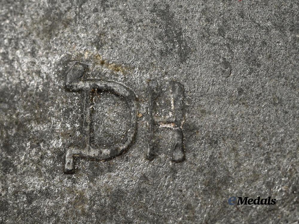 (Panzerkampfabzeichen in Silber). Constructed of silvered zink, the obverse consisting of an oval oak leaf wreath, joined together at the bottom by ribbon, topped by a Heer-style German national eagle clutching a mobile swastika, surrounding a central Panzer IV rolling over grassy terrain, with its left tread extending beyond the edge of the wreath, the reverse with a crimped barrel hinge and vertical pinback meeting around wire catch emanating from a circular plate, maker marked with the logo of Hermann Aurich, Dresden, measuring 41.64 mm (w) x 60.02 mm (h), weighing 30.2 grams, demonstrating minor loss of silver finish, in extremely fine condition.