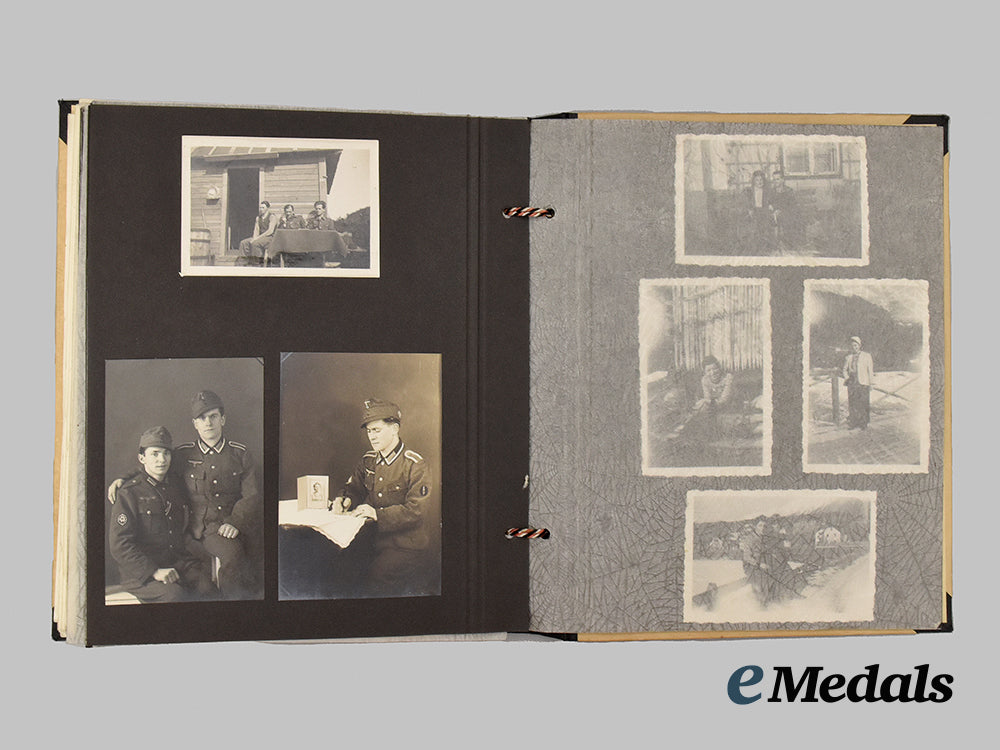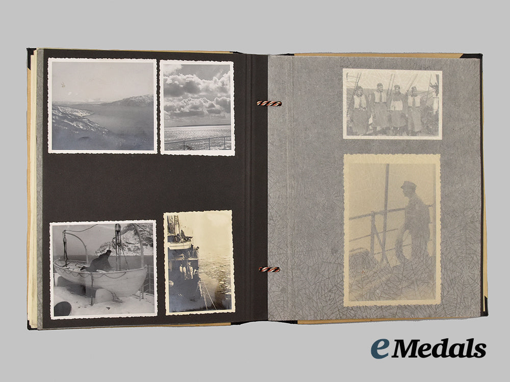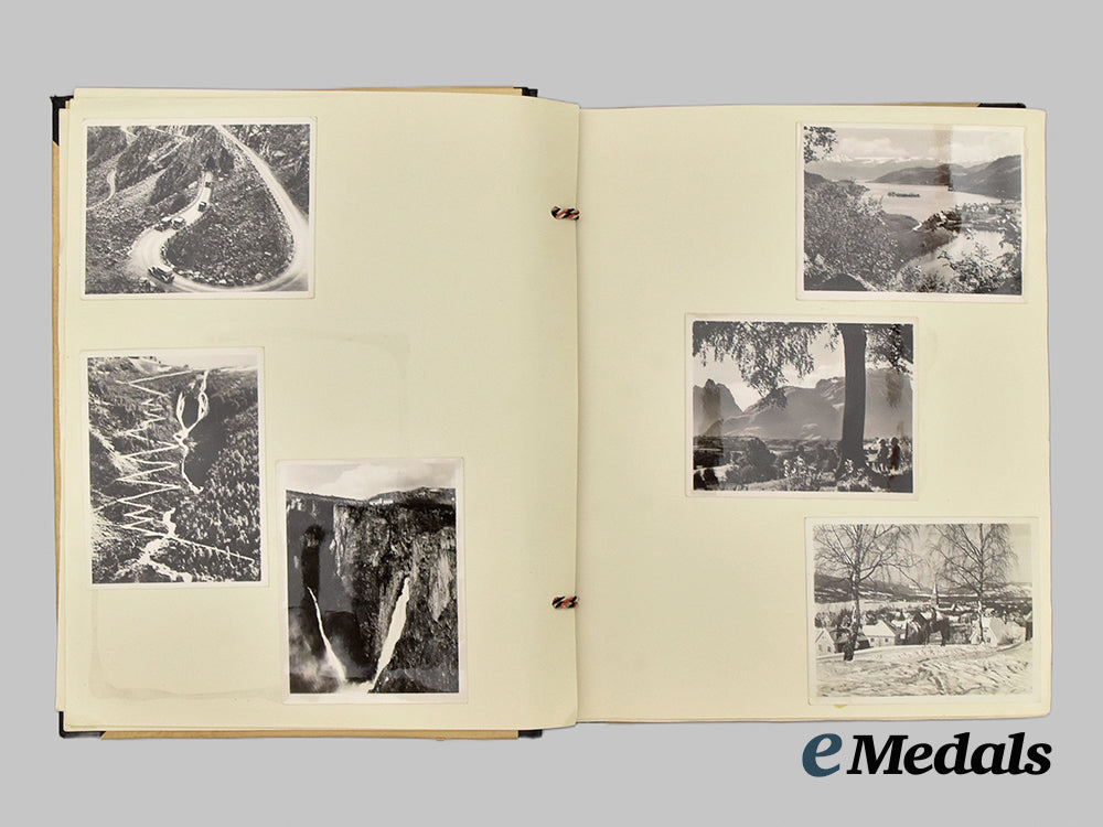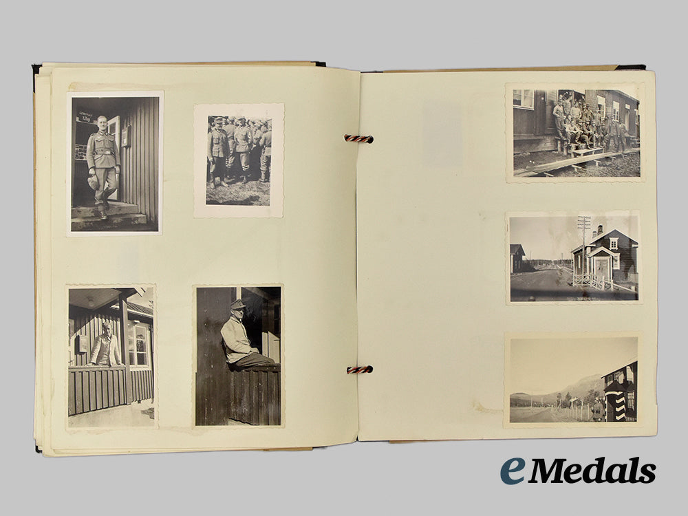 (Gebirgsjäger Fotoalbum). A superb private wartime photo album from the estate of a Heer Gebirgsjäger who saw extensive service in Norway, Finland, and the Soviet Union, constructed of a card stock binding, the cover bearing a raised 1939 Iron Cross executed with a blackened and silvered finish, the spine bearing a silvered inscription of “WEHRMACHT-FOTOALBUM” and perforated with four holes reinforced with magnetic metal grommets, with an original drawstring looped through the eyelets to maintain the album’s structural integrity, the interior content consisting of 34 paper stock and black card stock pagers, pasted with 179 black-and-white private and unit mass-produced images, the latter opening the album and encompassing striking shots of Norway, including scenes of fjords and winter landscapes, some featuring locals and Sami in traditional dress, transitioning a large number of private images featuring Heer Gebirgsjäger personnel departing Germany for Scandinavia, appearing to pass through occupied Denmark before arriving in Norway, with images of uniformed troops on occupation duty, participating in building projects, in the field, and at leisure, notably showing many veterans of the Battles of Narvik wearing the Narvik Shield (among other decorations), complemented by studio portraits of the owner in uniform and with family, also accompanied by six period postcards and two reproduction photos showing noted Mountain Troops Generals Eduard Dietl and Franz Böhme in uniform, the album measuring 20.5 cm (w) x 24.5 cm (h), a superb look at a Gebirgsjäger’s wartime experiences in extremely fine condition.