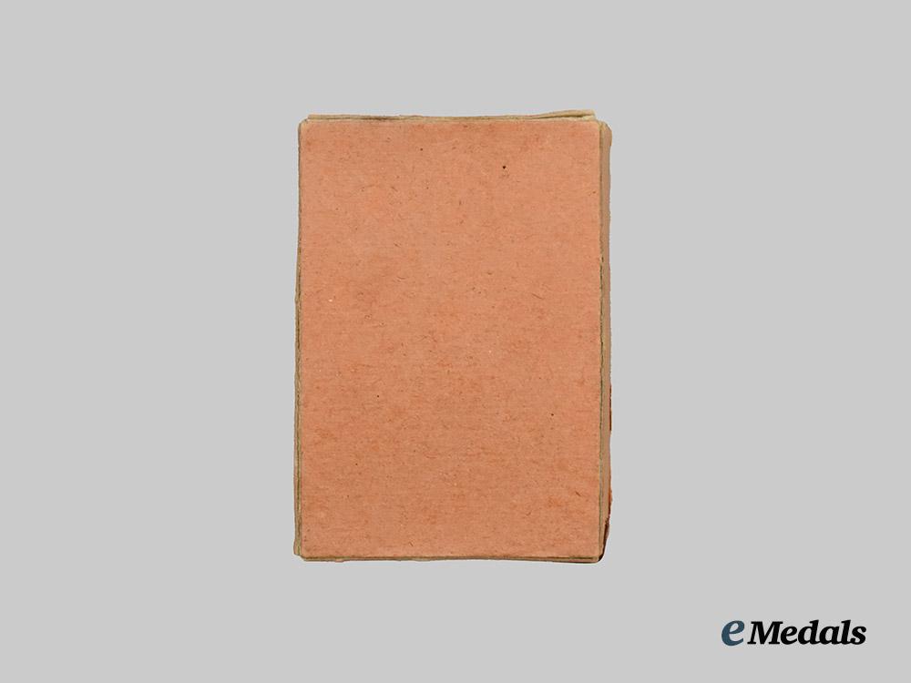 (Ostmedaille mit Etui). Constructed of silvered and patinated zink, on loop for suspension from its period original ribbon, the obverse bearing a raised Heer-style German national eagle clutching a swastika, the reverse bearing an inscription of “WINTERSCHLACHT IM OST 1941/42” (“WINTER BATTLE IN THE EAST 1941/42”), above a crossed sword and laurel branch, topped by a Stahlhelm and stick grenade, unmarked, measuring 36.14 mm (w) x 44.68 mm (h), weighing 19.2 grams, accompanied by a mis-matched period case, constructed of card stock, the interior of the lid stamped with a maker’s mark of “FRIEDRICH LINDEN, LÜDENSCHEID”, measuring 50 mm (w) x 70 mm (l) x 20 mm (h), originally containing one of Linden’s Wehrmacht badges but repurposed by the recipient, demonstrating loss of finish throughout the medal, in very fine condition.