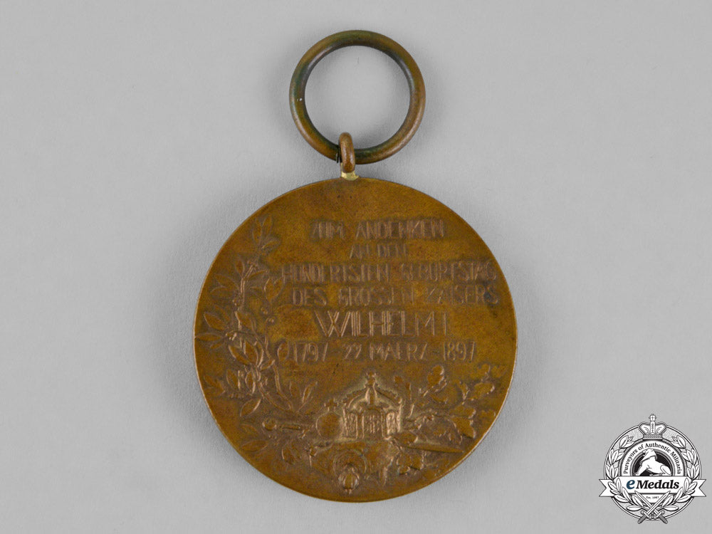 A grouping of two medals and awards, consisting of 1) A Hindenburg Cross “Ehrenkreuz des Weltkriegs 1914/1918” Widow’s Cross; a blackened metal (magnetic) cross pattée with crossed swords between the arms of the cross; the obverse inscribed with “1914/1918” within an open-ended laurel wreath; the reverse plain; maker marked with an unknown mark on the reverse; on a loop for suspension, with a widow’s ribbon; measuring 38.00 mm (w) x 37.82 mm (h); weighing 13.1 grams. 2) A 1897 Prussian Kaiser Wilhelm Centennial Medal (Kaiser Wilhelm Erinnerungsmedaille-Zentenarmedaille); a gilt bronze medal; the obverse with a leftward facing bust of Kaiser Wilhelm, inscribed “Wilhelm der Grosse Deutscher Kaiser, Koenig von Preussen” (German - Wilhelm the Great German Kaiser, King of Prussia); the reverse inscribed “Zum andenken an den hundertsten Geburtstag des Grossen Kaisers Wilhelm I, 1797 - 22 Maerz 1897 (German - In remembrance of the one hundreth birthday of Wilhelm I); measuring 40.00 in diameter; weighing 34.3 grams. The cross well preserved with the gilt mostly worn off the medal; in overall near extremely fine condition.
