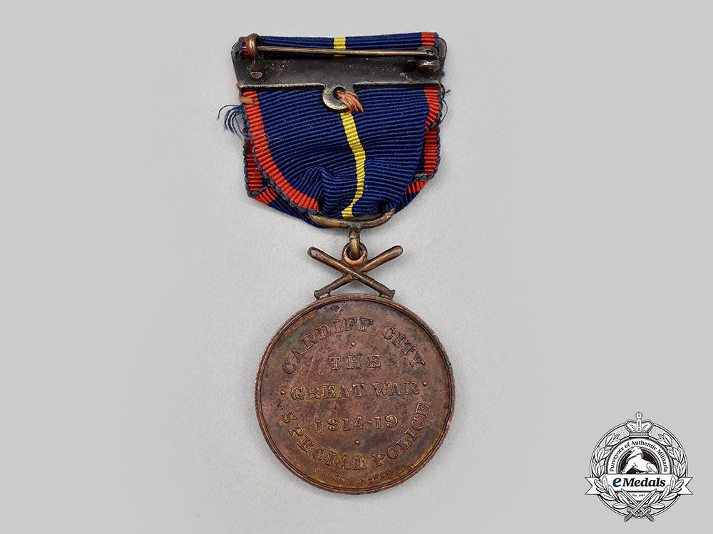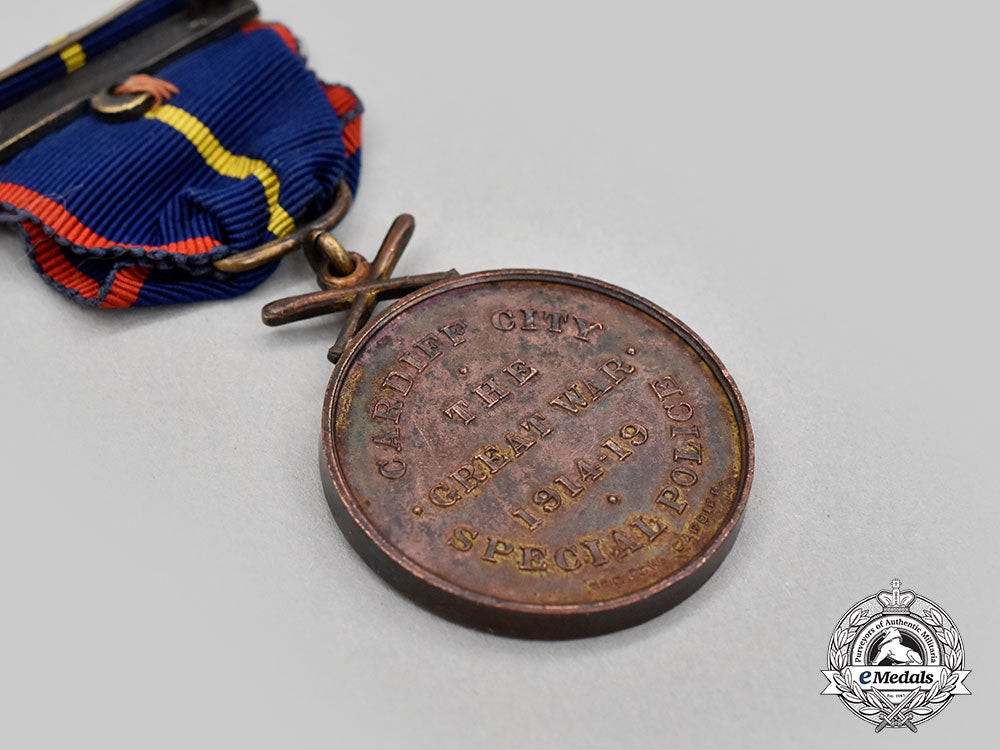 In bronze, obverse illustrating the City of Cardiff, Wales coat-of-arms, reverse inscribed "THE GREAT WAR 1914-19" in the centre, surrounded by the inscription "CARDIFF CITY SPECIAL POLICE" and engraver marked "CROUCH. CARFIFF.", measuring 32 mm (w) x 40 mm (h) inclusive of its crossed batons and integral ring suspension, edge nicks, spotting, original ribbon with pinback, near extremely fine.