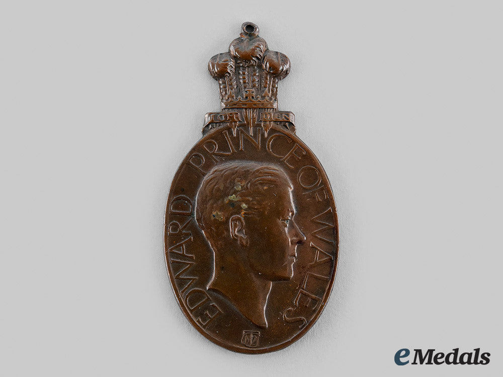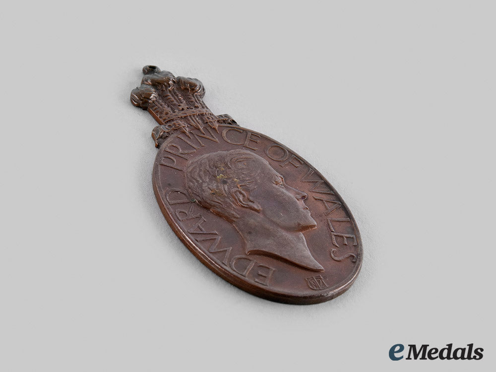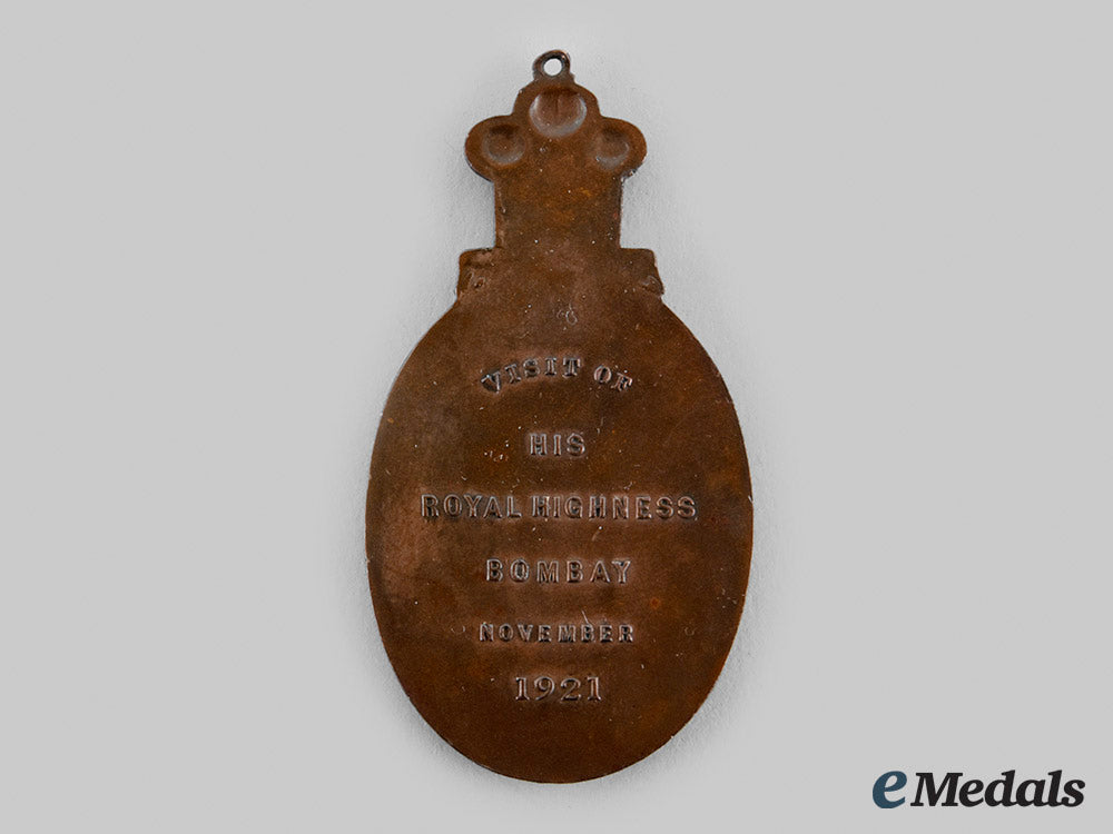 In bronze, obverse illustrating the right-facing bust of Edward, Prince of Wales, surrounded by the inscription "EDWARD PRINCE OF WALES", surmounted by the heraldic badge of the Prince of Wales, engraver marked with the initials "CT" (C.W. Thomas) intertwined with the date "1921" at the base, reverse inscribed "VISIT OF HIS ROYAL HIGHNESS BOMBAY NOVEMBER 1921", measuring 31 mm (w) x 58.5 mm (h) inclusive of its integral suspension, contact marks, better than very fine.
