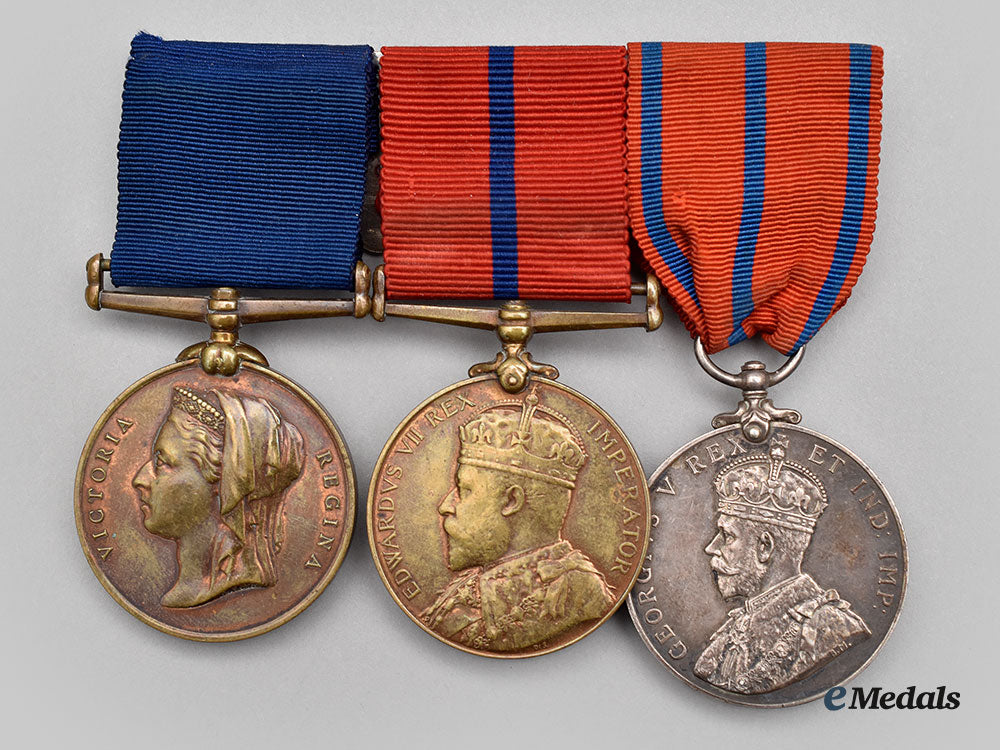 Naming is officially engraved in large capital on all three medals. Mounted to a suspension with swing bar pinback, as worn by the veteran, the latter two medals with contact marks evident on the faces of the monarchs, original ribbons, very fine.