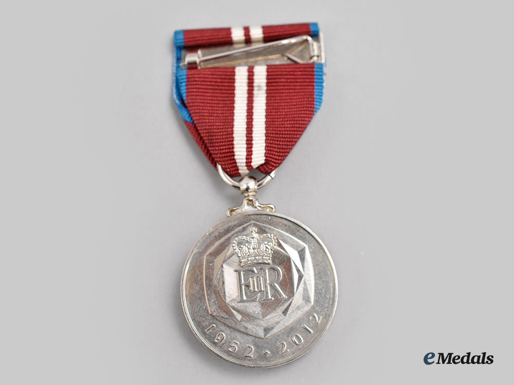 Footnote: The Queen Elizabeth II Diamond Jubilee Medal (AKA The Queen's Diamond Jubilee Medal) is a commemorative medal created in 2012, to mark the sixtieth anniversary of Queen Elizabeth II's accession in 1952. There are four versions of the medal: one issued by the United Kingdom, another by Canada, the third for the Caribbean realms of Antigua and Barbuda, the Bahamas, Barbados, Grenada, Jamaica, Saint Kitts and Nevis, Saint Lucia, and Saint Vincent and the Grenadines, and the fourth issued by Papua New Guinea. The ribbons used with the Canadian and British versions of the medal are the same, while the ribbon of the Caribbean and the Papua New Guinean medal differ slightly. The different iterations of the medal were presented to tens of thousands of recipients throughout the Commonwealth realms in the jubilee year.